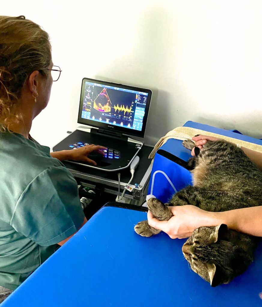Echografie is een beeldvormende techniek waarbij we met behulp van geluidsgolven de inwendige organen van uw huisdier in beeld kunnen brengen. Het is een pijnloze en veilige methode die ons toelaat om op een niet-invasieve manier informatie te verzamelen over bijvoorbeeld de buikorganen of het hart.